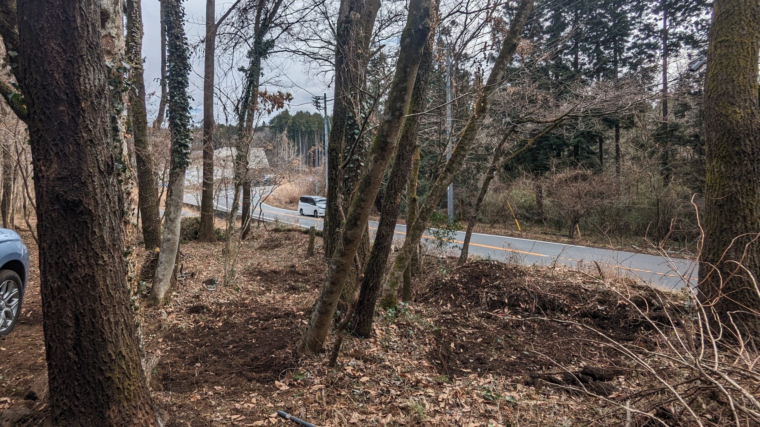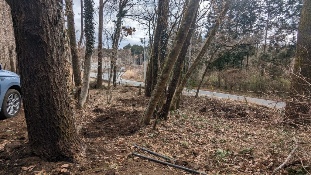 この隣地は40年前に区画分譲販売で持ち主が数名、すべて40年以上放置、水道が引けない、など住むには悪条件がそろっているので一般的には利用価値は少ないし”どこか”借りれて今DIYでやっている伐採~簡易整地すればとりあえずの駐車場は確保できるので可能性は大。