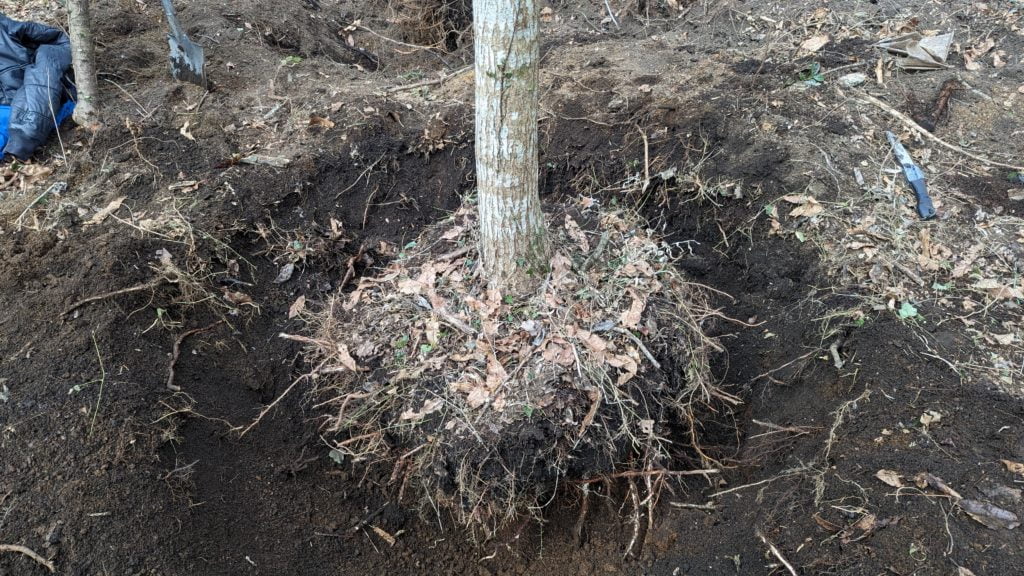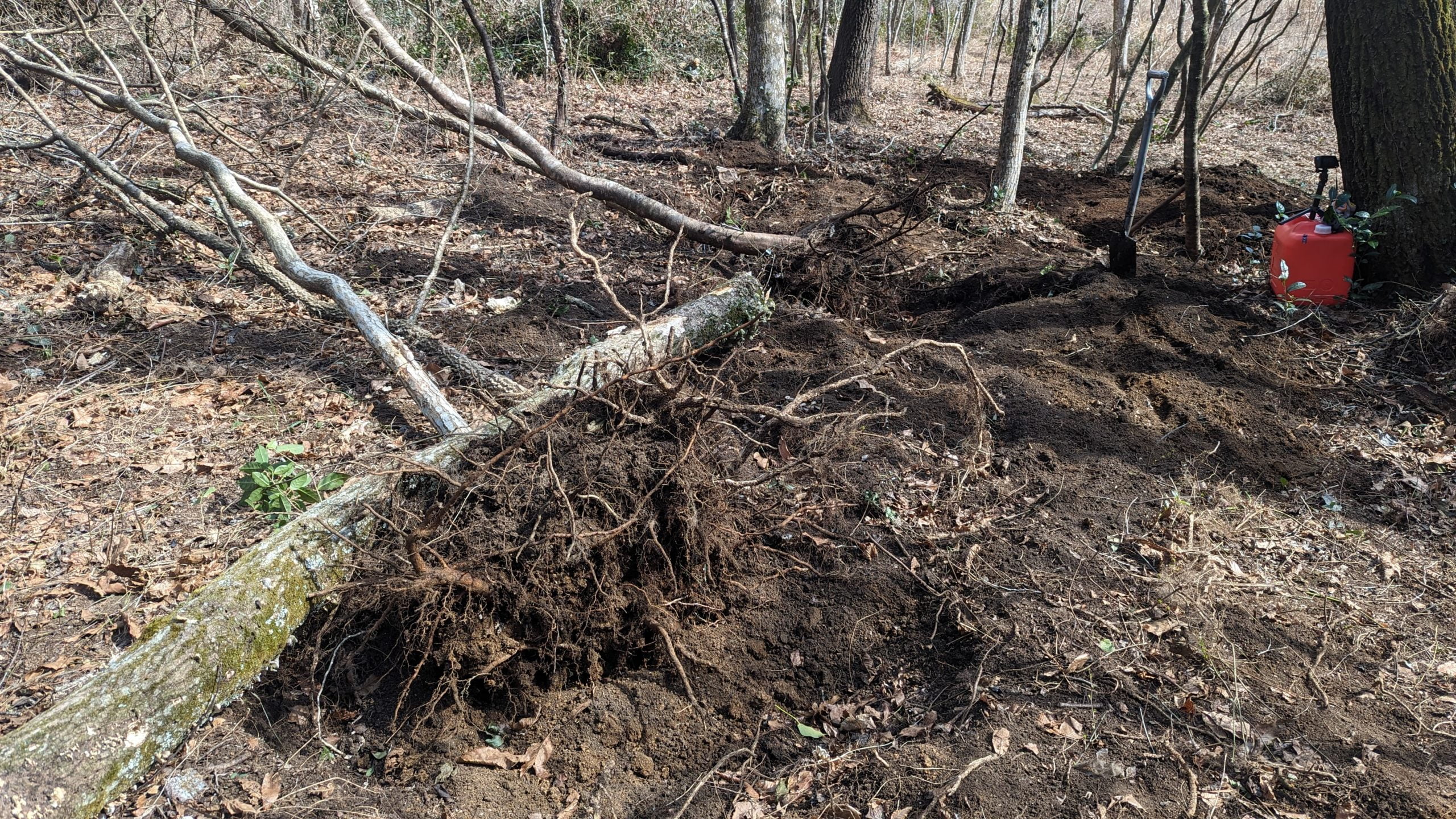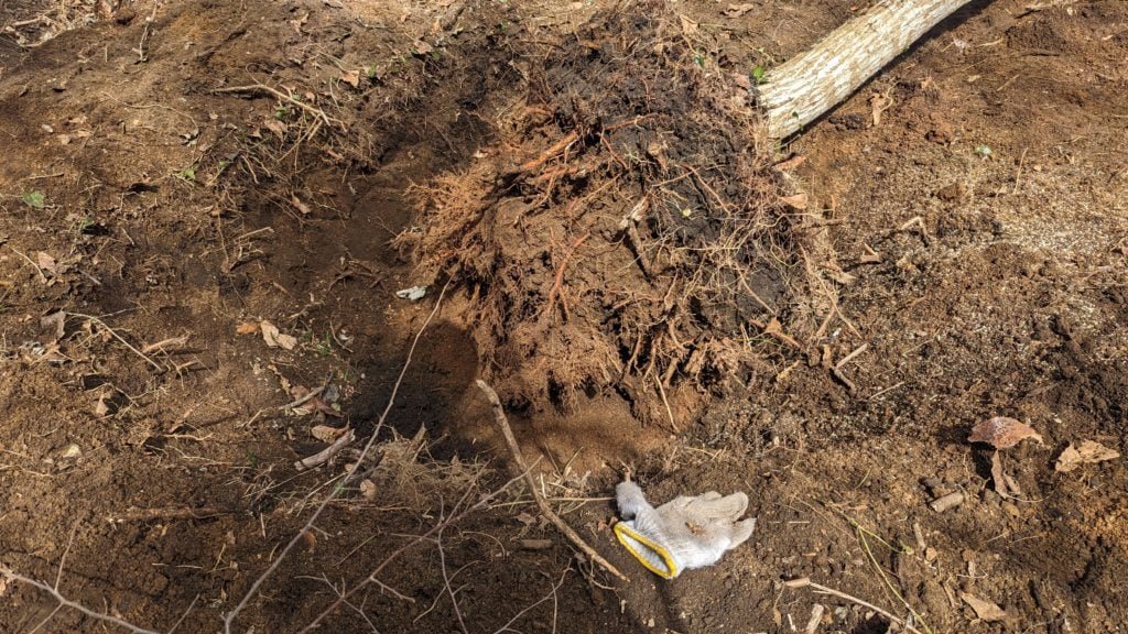 前回1時間ほど今日2時間 合計3時間で半分以上根の下を掘っても1㎝ぐらいしかグラつかず永遠に感じたこの木の伐根もこぶし大のほぼ幹みたいな木の根をほぼ真下に発見