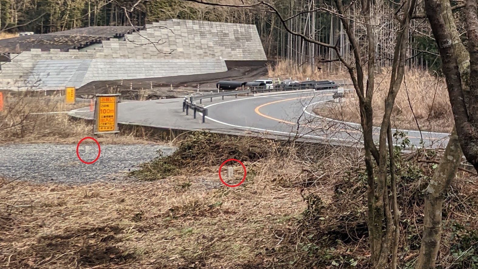 写真手前杭だと10m以上違う事になるし奥側の杭でも2mほど足りないのでさすがに無いでしょう