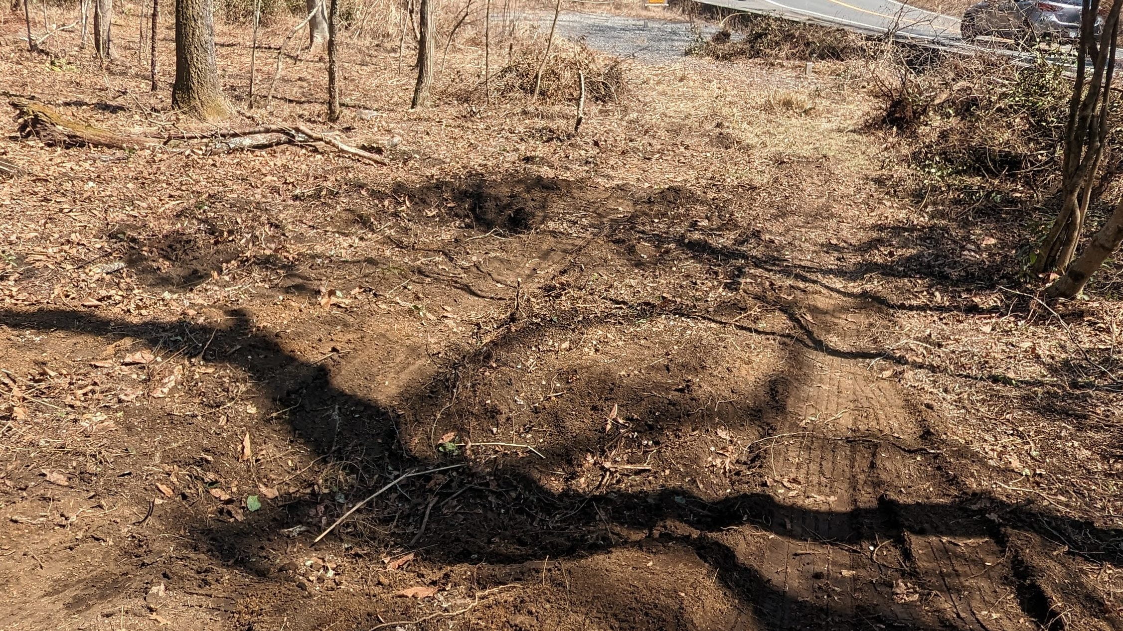 写真だとわかりずらいのですがこの駐車場になる場所が若干傾斜が強いのでそこの土砂を利用して伐根跡の穴を埋める事に。