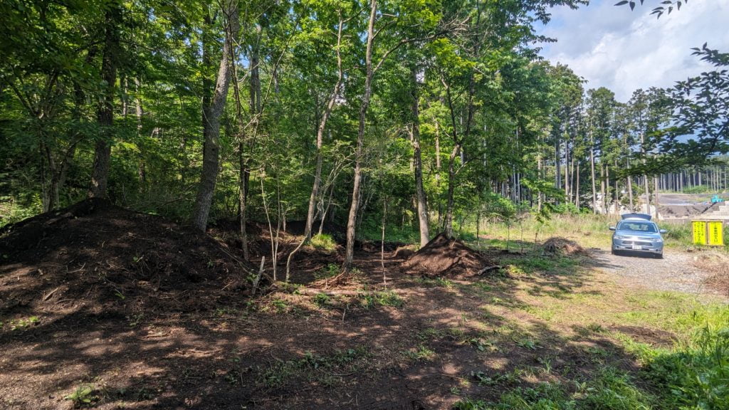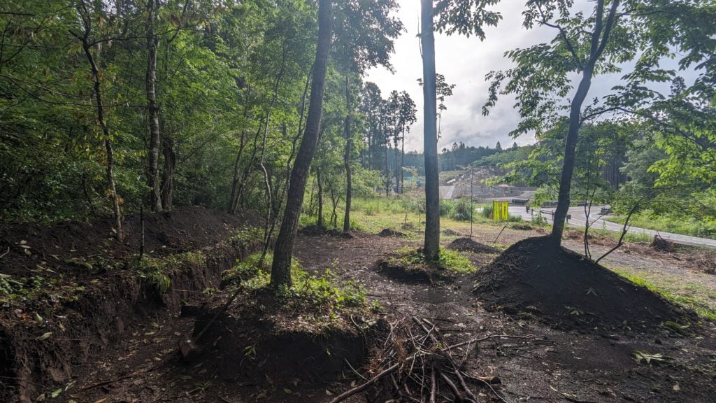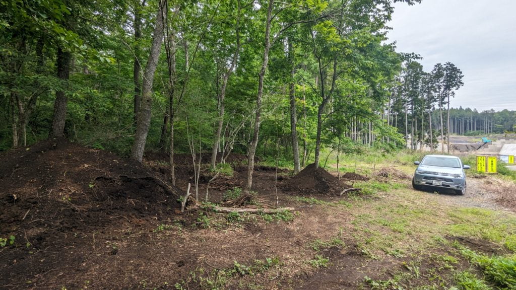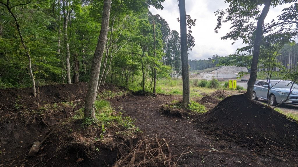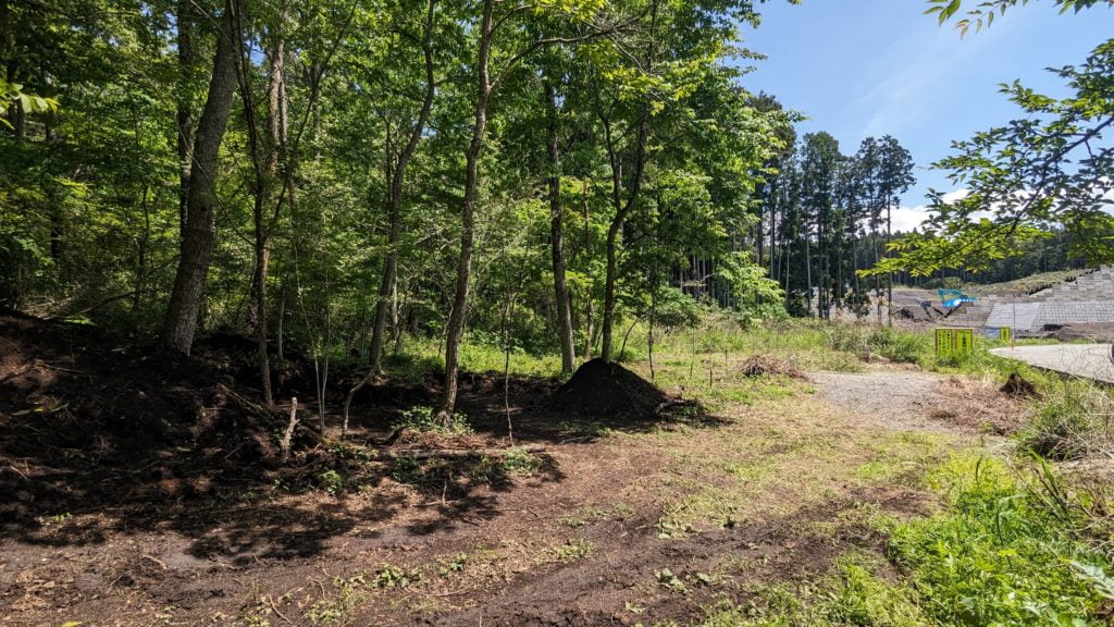 ドッグランと駐車場の場所を変更したのでそれに合わせて大きめ(10m~20m)な枯れ木と役所に登録されていない小さな木を伐根&伐採、使えそうな木々を植え替え、土地の整地をしています。